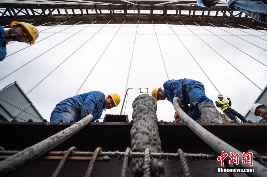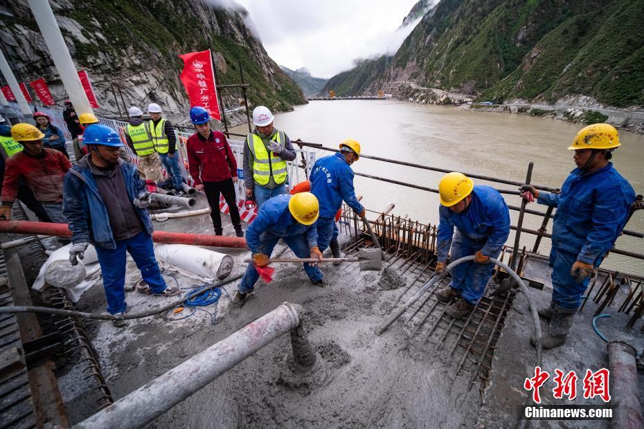 6月20日,中鐵廣州工程局工人在位于西藏自治區(qū)加查縣的藏木特大橋工地進(jìn)行混凝土澆筑作業(yè)。中新社記者 何蓬磊 攝
