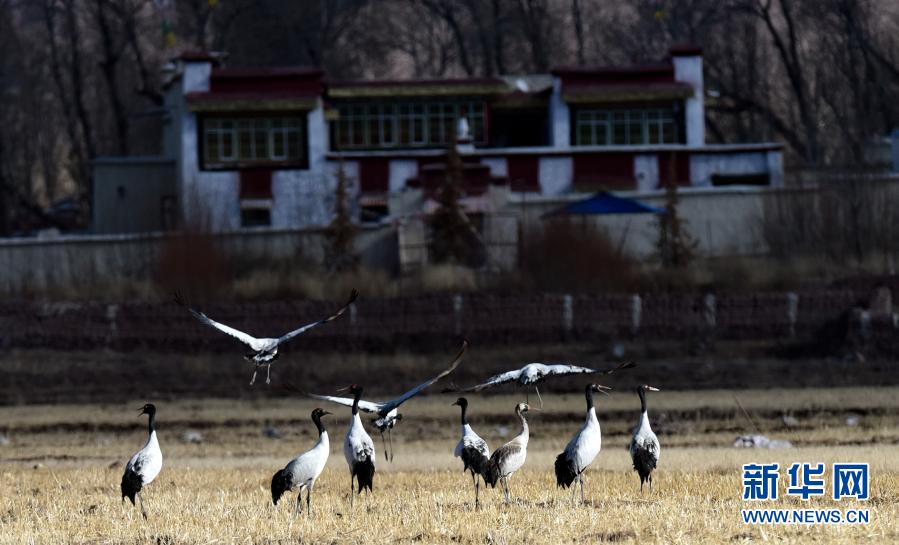 棲息在林周縣卡孜鄉(xiāng)農田里的黑頸鶴(12月12日攝)。新華社記者 張汝鋒 攝