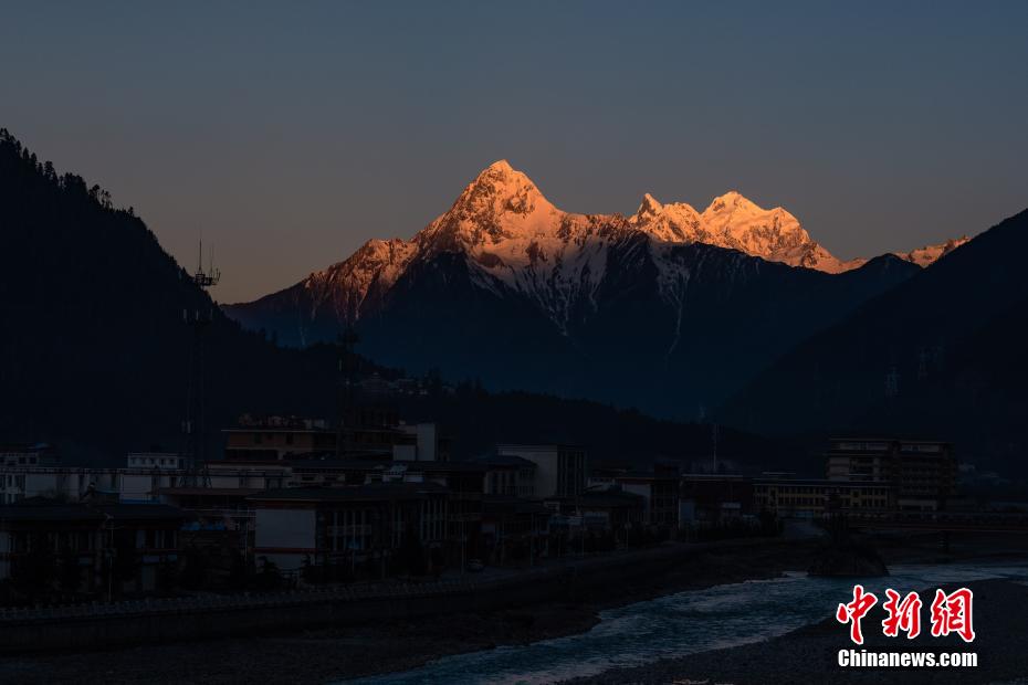 圖為波密縣城日照金山景觀。何蓬磊 攝