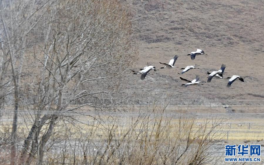 黑頸鶴在林周縣黑頸鶴自然保護區(qū)里飛翔(3月14日攝)。新華社記者 張汝鋒 攝