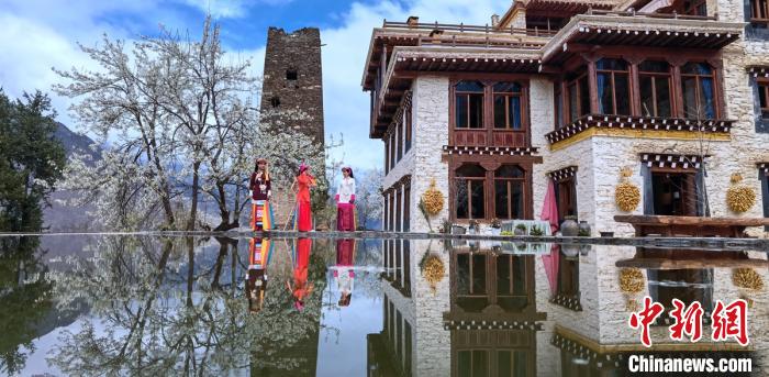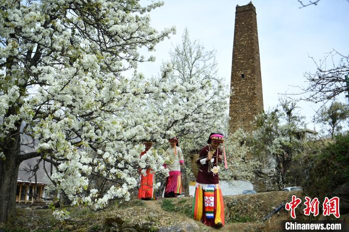 藏寨、碉樓下盛開(kāi)的梨花,丹巴女孩穿梭鄉(xiāng)間小路。劉忠俊 攝