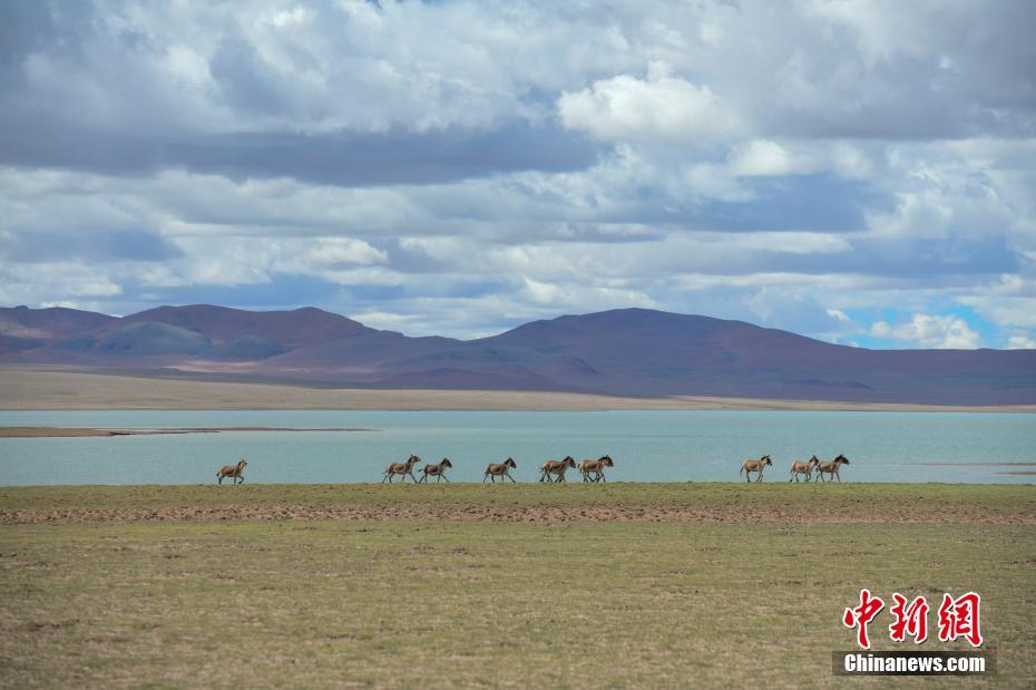 6月19日,西藏那曲羌塘草原上的藏野驢在湖邊奔騰跳躍。羌塘草原位于西藏自治區(qū)北部,平均海拔超過(guò)4600米,是目前中國(guó)海拔最高、面積最大的自然保護(hù)區(qū)。這里是野生動(dòng)物的樂(lè)園,藏羚羊、藏原羚、藏野驢等珍稀野生動(dòng)物與雪山、草地、藍(lán)天、白云,構(gòu)成撼人心魄的壯美畫(huà)面。 中新社記者 貢嘎來(lái)松 攝