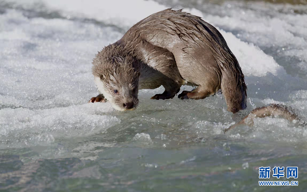 兩只歐亞水獺在扎曲河畔嬉戲。新華網(wǎng)發(fā)(文德 攝)