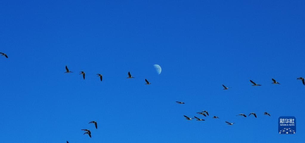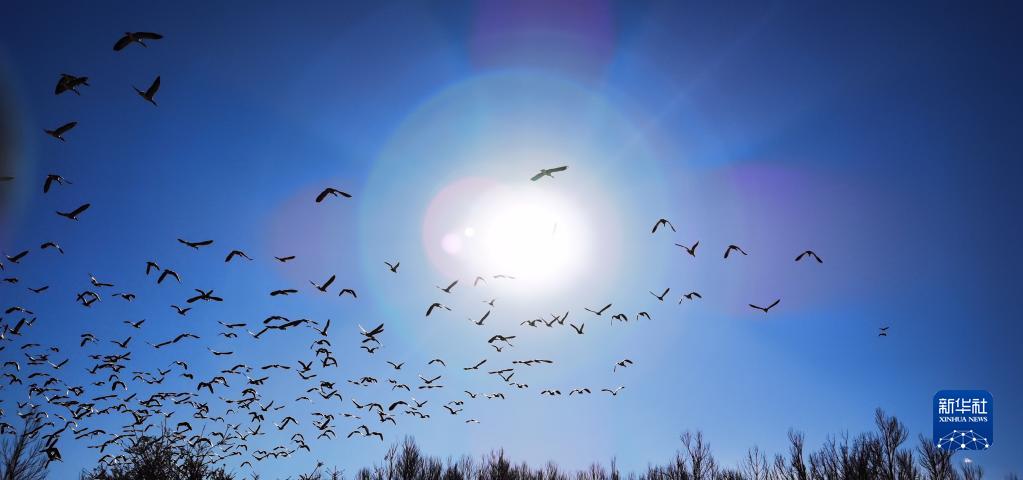 候鳥(niǎo)飛過(guò)唐嘎濕地(12月11日攝,手機(jī)照片)。新華社記者 沈虹冰 攝