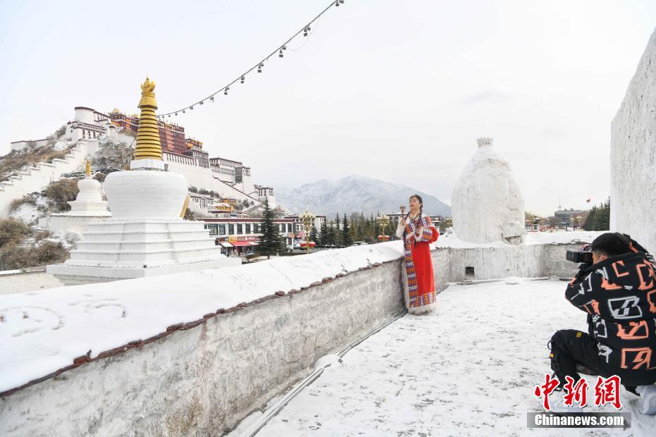 2月21日,游客穿著藏族傳統(tǒng)服飾在布達(dá)拉宮拍照留念。當(dāng)日,西藏拉薩市迎來(lái)降雪,雪后的拉薩城區(qū)和周?chē)荷桨籽┌}皚,風(fēng)景如畫(huà)。 中新社記者 貢嘎來(lái)松 攝