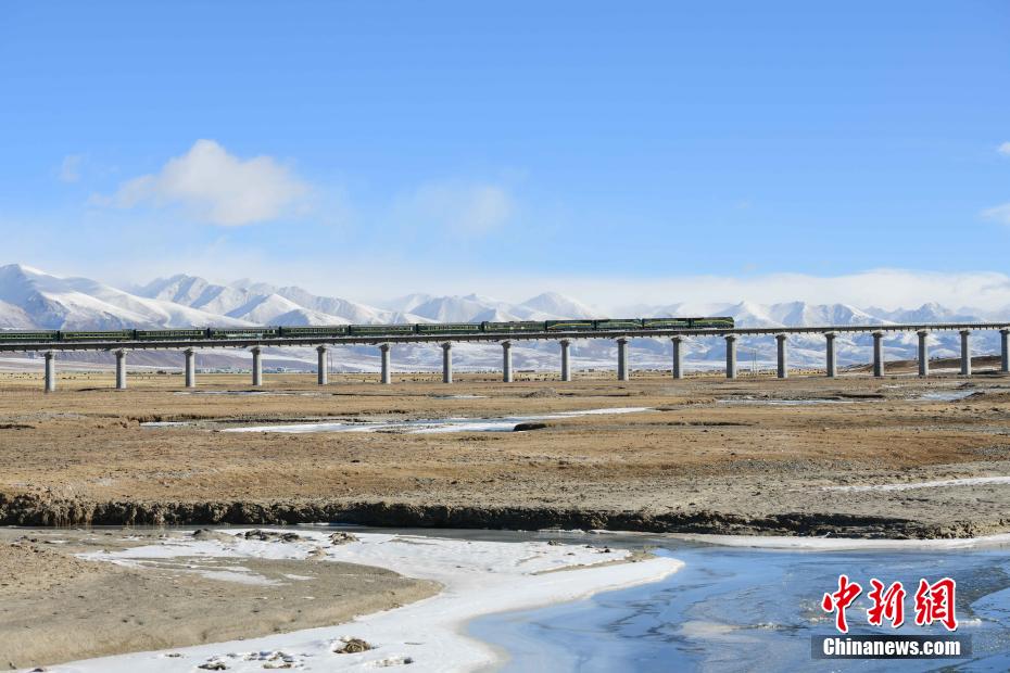 圖為一輛火車從當雄縣阿熱濕地經過。 貢嘎來松 攝