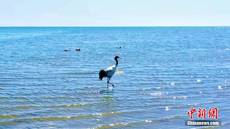 作為中國最大的內(nèi)陸湖泊,青海湖不僅是維系青藏高原東北部生態(tài)安全的重要水體、控制西部荒漠化向東蔓延的天然屏障,也是中亞、東亞兩條候鳥遷徙路線的交匯點,是中國境內(nèi)候鳥繁殖數(shù)量最多、種群最為集中的繁殖地。圖為在湖邊散步的黑頸鶴。 張世偉 攝