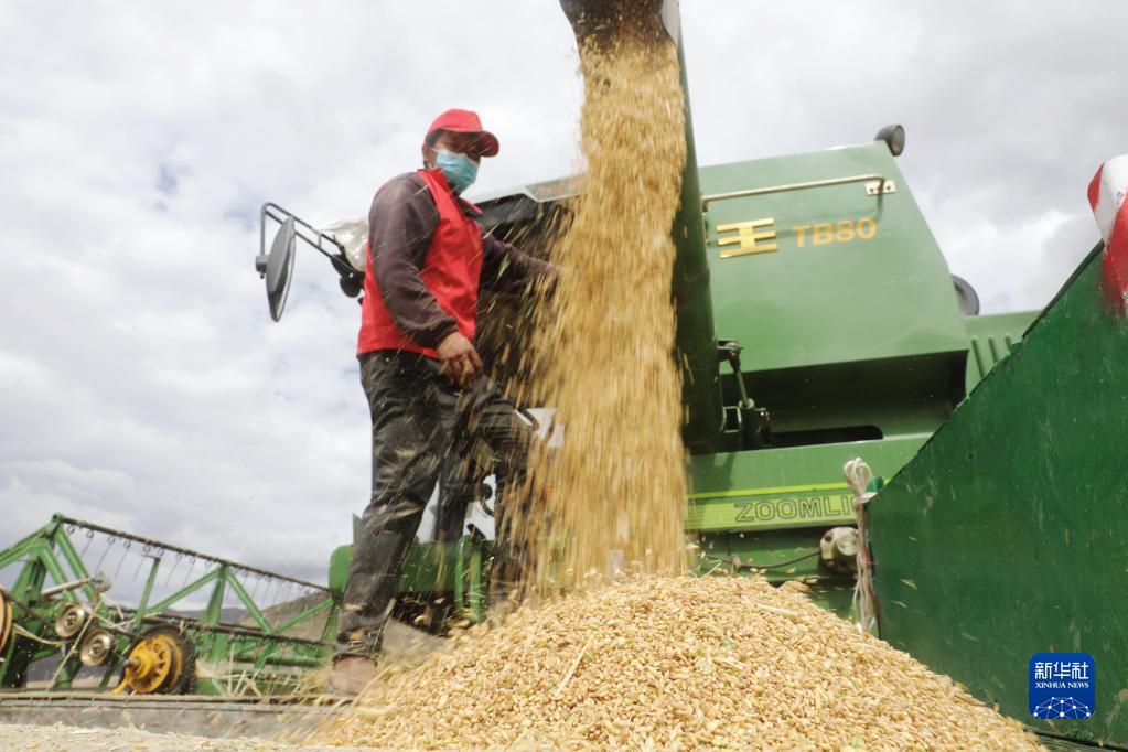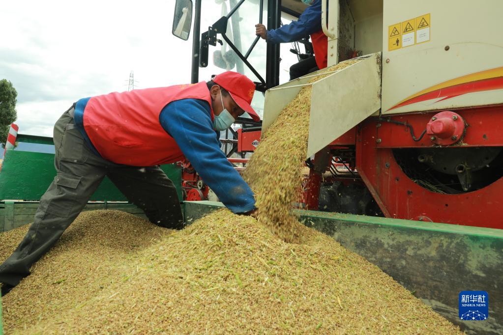 目前,西藏各地進(jìn)入秋收時(shí)節(jié)。西藏拉薩市墨竹工卡縣農(nóng)民在積極防疫的同時(shí),抓緊收割青稞,確保顆粒歸倉。