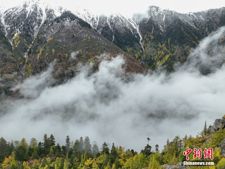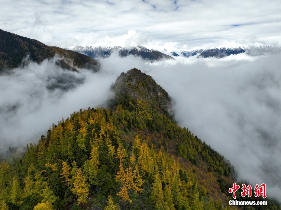 10月26日,航拍西藏多雄拉雪山,雪山與層林盡染的森林組成一幅壯美的秋日高原畫卷。西藏林芝多雄拉雪山位于喜馬拉雅山脈北段主脊,曾是徒步進(jìn)入墨脫縣最艱險的路段之一。(無人機(jī)照片) 中新社發(fā) 董志雄 攝