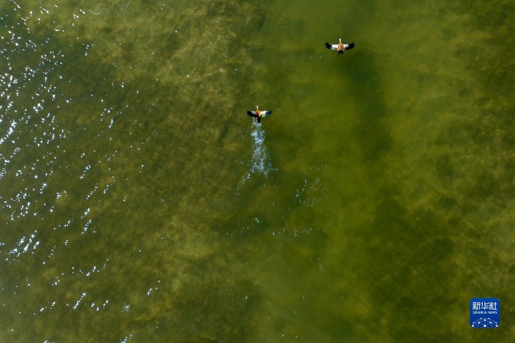 飛鳥從打加錯湖面掠過(無人機(jī)照片,8月30日攝)。新華社發(fā)(旦增努布 攝)