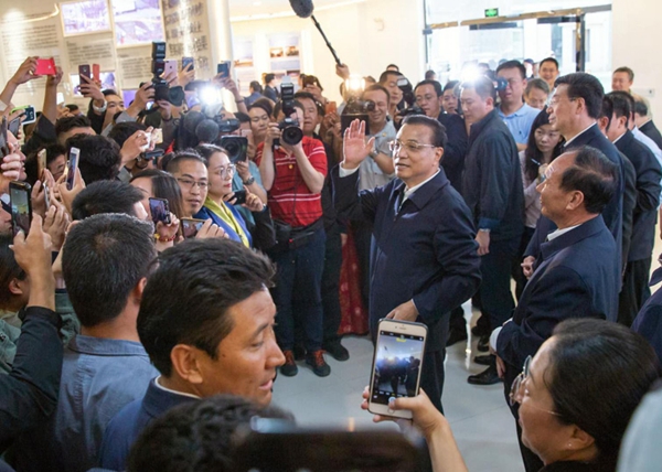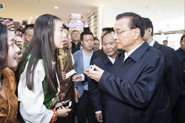 圖為李克強(qiáng)總理在拉薩柳梧高新技術(shù)開(kāi)發(fā)區(qū)國(guó)家雙創(chuàng)示范基地與大家親切交談。攝影:謝圓