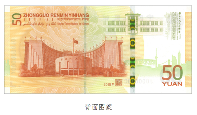 紀(jì)念鈔背面主景圖案為中國(guó)人民銀行大樓,輔以牡丹花、中國(guó)人民銀行舊址、第一套人民幣發(fā)行布告及城市建筑剪影圖案。票面左上角為面額數(shù)字“50”,中國(guó)人民銀行漢語拼音字母和蒙、藏、維、壯四種民族文字的“中國(guó)人民銀行”字樣與面額。票面下方為行長(zhǎng)章與年號(hào)文字“2018年”。票面右下角為面額數(shù)字“50”,漢語拼音字母“YUAN”。