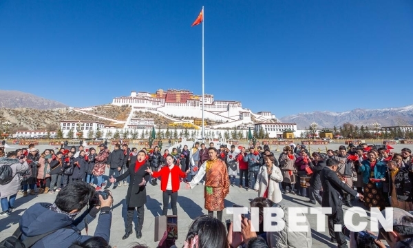 中國(guó)西藏網(wǎng)訊 2018年12月31日,年終歲末,西藏自治區(qū)拉薩市布達(dá)拉宮廣場(chǎng)上演了《我和我的祖國(guó)》快閃活動(dòng)。來(lái)自西藏的高校青年學(xué)生和市民群眾向祖國(guó)深情告白,用快閃的方式慶祝新中國(guó)成立70周年。