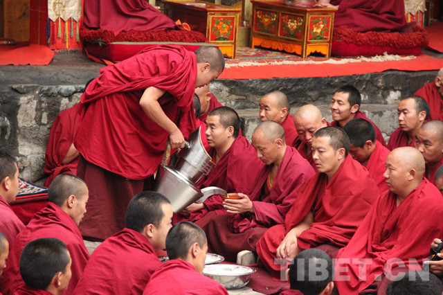 藏族社會的飲茶之風(fēng),從藏傳佛教寺院僧眾一天的生活中也能窺見一斑。通常僧人們每日集體飲三次茶,即在早、中、晚三個時間段的誦經(jīng)禮佛活動后,由寺院統(tǒng)一熬茶分給他們喝。特別是在舉行法事活動的時候,僧人飲茶就表現(xiàn)得更為明顯:每當(dāng)舉行法事儀式時,莊重肅穆的經(jīng)堂內(nèi),僧人們誦讀經(jīng)文。待斟茶之際,眾僧從自己懷里取出隨身攜帶的茶碗放在跟前,就有專門負責(zé)司茶的年輕僧人提著茶壺給眾僧斟茶。