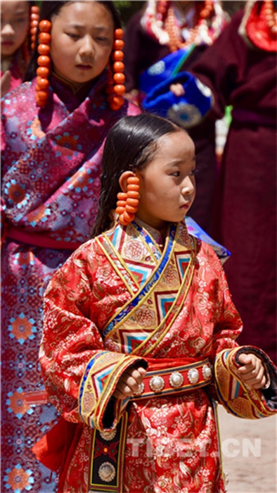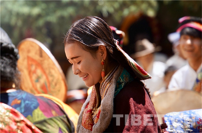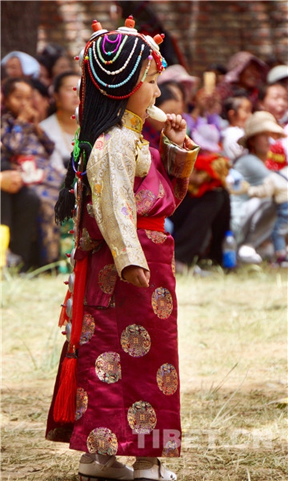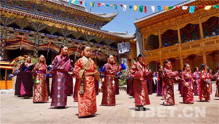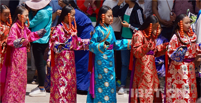 六月會(huì)期間有多場(chǎng)舞蹈表演,參與者是年輕的未婚女子,她們穿上最隆重的藏袍,綴上珊瑚蜜蠟松石銀飾,精施粉黛,莊重優(yōu)雅地舉手抬步緩行。舞蹈的動(dòng)作簡(jiǎn)單緩慢,但是女孩子們個(gè)個(gè)奪目。