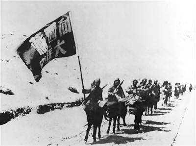 次日,當(dāng)東方剛剛發(fā)白,先遣隊便開始了攀登大冰山的戰(zhàn)斗。冰山上空氣稀薄,坡陡無路,騎隊攀登艱難。戰(zhàn)士們的胸口悶得發(fā)慌,心臟好像要從嘴里跳出來,頭痛得好似腦袋要開裂,馬也張著嘴喘著粗氣。有的戰(zhàn)士用手絹把頭緊緊綁住,有的拉著馬尾前進,有的倚著馬堅持邁步。高原反應(yīng)嚴(yán)重者,幾乎昏迷過去,體質(zhì)較強的同志攙扶著體弱的。戰(zhàn)士們難受得既不能吃,也不想喝,一百多人四頓飯只吃了八十來斤糧食。