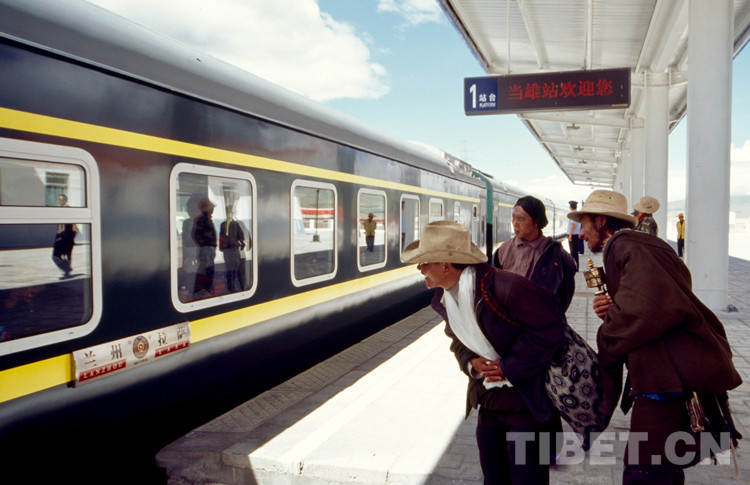 圖為藏族群眾欣喜地張望剛開通的列車駛進車站 攝影:陳丹