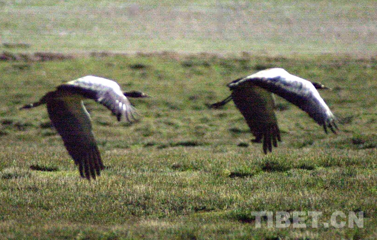 圖為正在色林錯(cuò)國家級(jí)自然保護(hù)區(qū)飛翔的黑頸鶴(唐召明2001年攝)