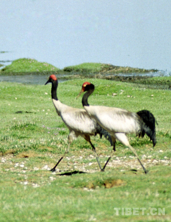 圖為一對(duì)在色林錯(cuò)國家級(jí)自然保護(hù)區(qū)湖邊漫步的黑頸鶴(唐召明2001年攝)