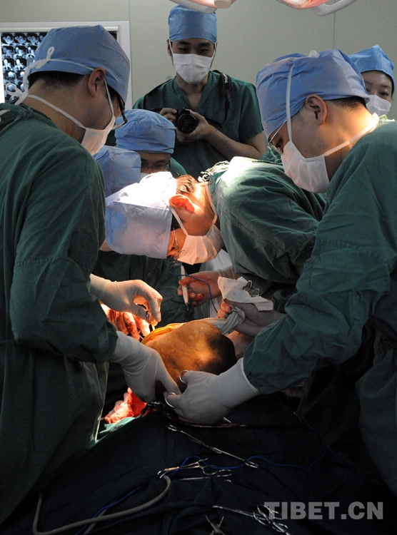2010年4月21日,北京口腔醫(yī)院口腔頜面外科醫(yī)生在實(shí)施手術(shù)。當(dāng)日上午11時(shí)許,北京口腔醫(yī)院醫(yī)生為藏族婦女斯求卓瑪實(shí)施手術(shù),將其脖子上一個(gè)重達(dá)5公斤的巨大腫瘤成功切除(唐召明2010年4月21日攝)