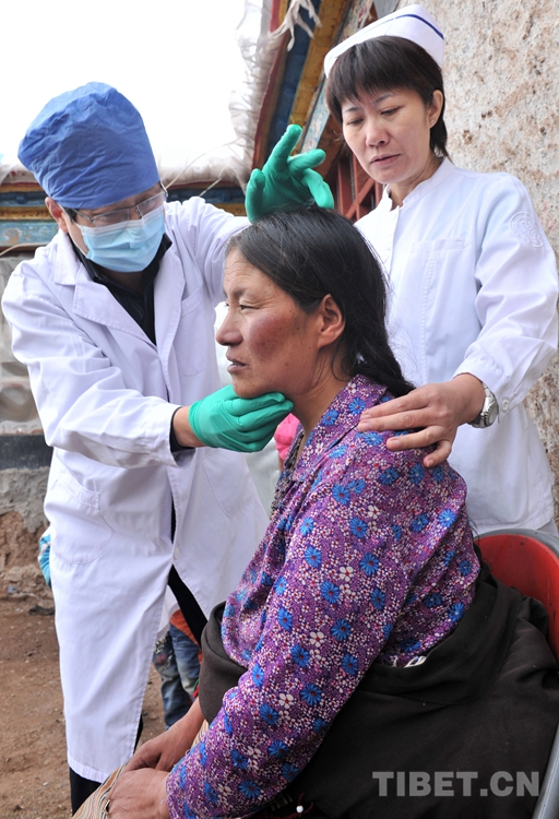 曾為斯求卓瑪進(jìn)行手術(shù)的北京口腔醫(yī)院頭頸腫瘤科主任韓正學(xué)(左)上門(mén)來(lái)到班戈縣新吉鄉(xiāng),為斯求卓瑪做術(shù)后檢查(唐召明2015年7月14日攝)