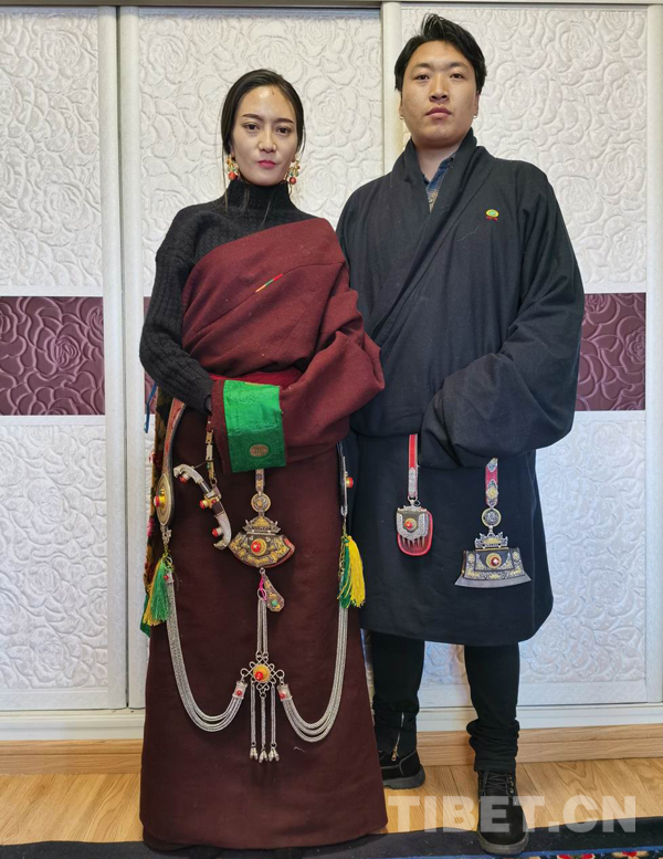 索南旦周最小的女兒叫梅朵,今年23歲,“梅朵”漢語意為“花朵”,她和她的名字一樣漂亮。她是索南旦周家里識文斷字的人。她的老公尕瑪才丁人高馬大,是典型的康巴漢子,他電大畢業(yè)后自主創(chuàng)業(yè),選擇靠祖?zhèn)鞯慕疸y首飾、佛像制造安身立命,在結(jié)古地區(qū)小有名氣。他打制的金銀首飾,精工細(xì)作,一絲不茍,真材實(shí)料,信譽(yù)度很好。他們主要接廠家和散戶訂制。梅朵兩口子不善言語,而他倆一帥一美,藏裝上佩戴各式自己打制的金銀裝飾品,是最好的語言和廣告。(中國西藏網(wǎng) 通訊員/才仁當(dāng)智)