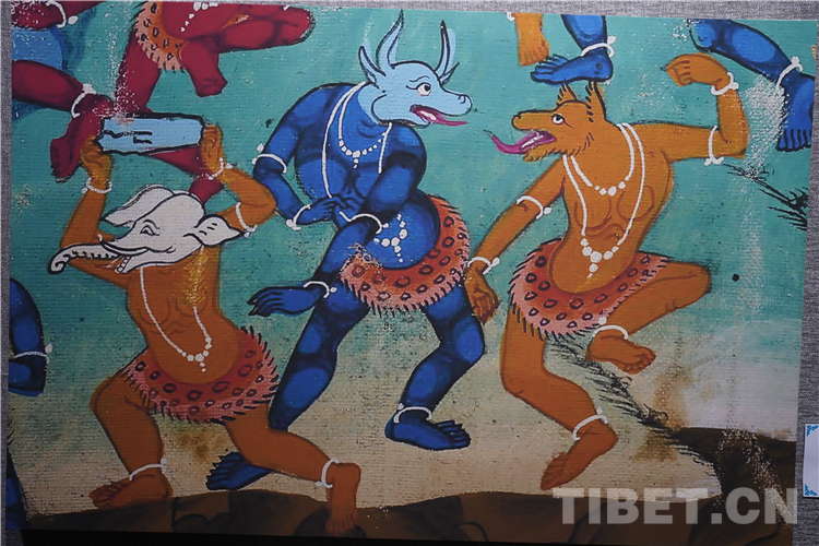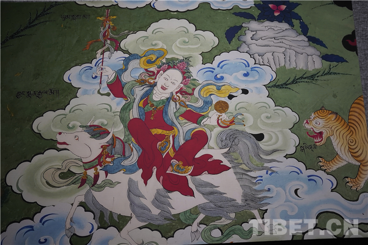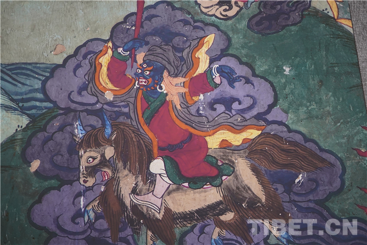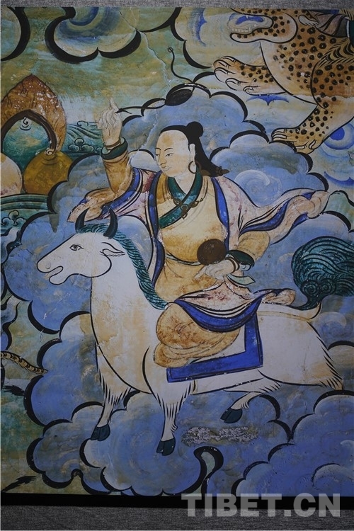 展廳中還有一副遠看非常另類,細細欣賞漢藏繪畫風格交流交融的作品,那是一幅四川省阿壩藏族羌族自治州金川縣墨爾多神山壁畫的局部作品。東智先生說:“這幅局部畫作從發(fā)髻、服飾等多個方面充滿了漢族風格,甚至人物穿的還是漢服,座下是像馬一樣的牦牛,但是手上掄著古朵(古朵指的是用牦牛毛或者山羊毛編織成的拋石繩,可以將石頭投擲到較遠的地方,是牧民們用來放牧的工具),非常有辨識度,充滿藏族文化特色。”