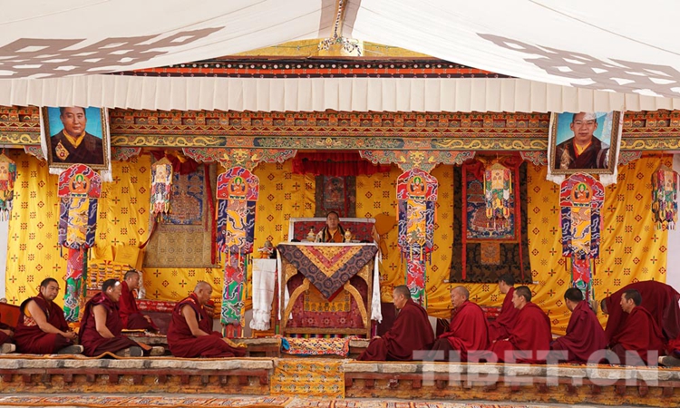 在熱堆寺,十一世班禪禮佛并為正在修建的大殿開(kāi)光加持。隨后,十一世班禪在寺內(nèi)辯經(jīng)場(chǎng)為僧眾摸頂,并傳授《菩提道矩論》。