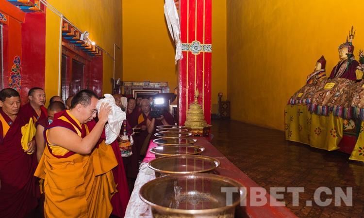 在乳巴寺,十一世班禪先后朝拜了甘珠爾拉康、文物珍寶殿、護(hù)法神殿等,隨后在杜康殿為僧眾摸頂傳授《兜率天上師瑜伽修法》。(中國(guó)西藏網(wǎng) 記者/王淑 趙耀 鄭朔)