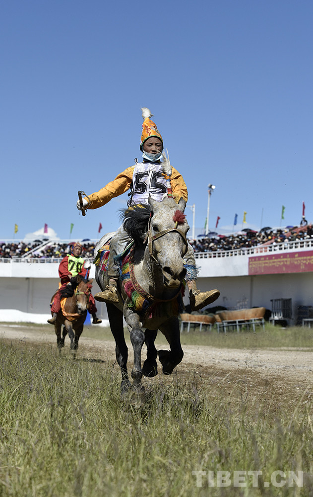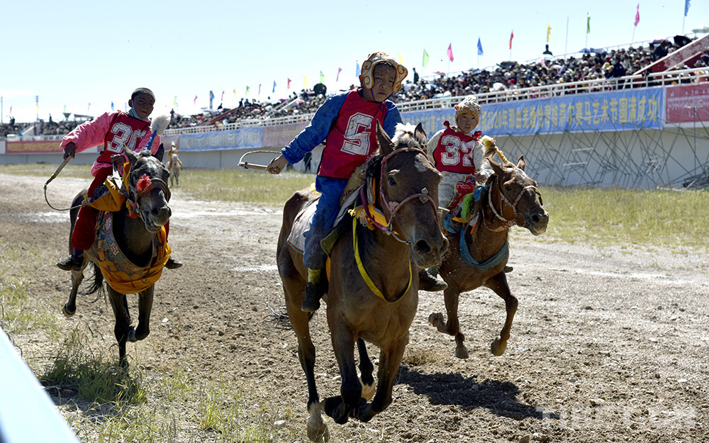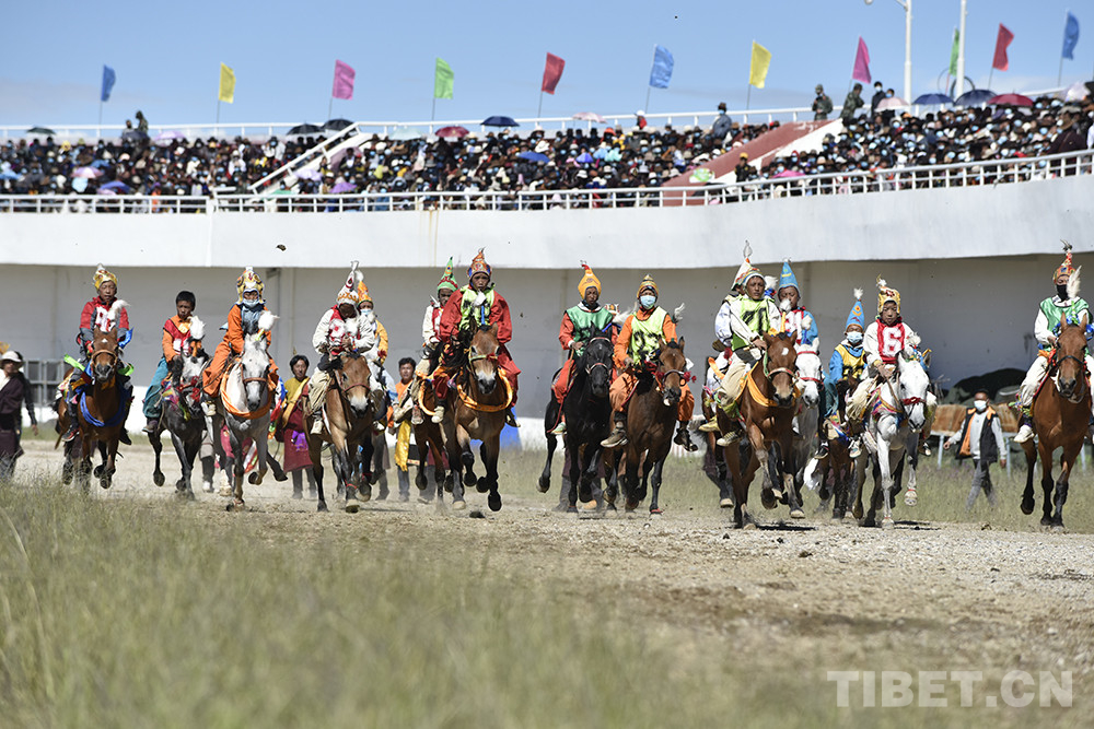 8月12日上午,西藏自治區(qū)那曲市2020羌塘恰青格薩爾賽馬藝術(shù)節(jié)的重頭戲——場內(nèi)速度賽馬比賽開始。賽道內(nèi),沙塵飛濺;看臺上,座無虛席,吶喊助威。