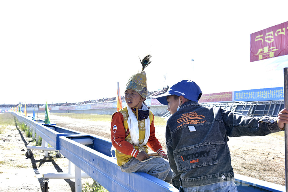 看了兩組比賽后,三兄弟奔跑到集合地點,要準(zhǔn)備比賽了??粗绺缋蜕V楹瓦_(dá)瓦頓珠頭戴盔狀帽子、上穿黃色藏式上衣、手持竹把小鞭子,11歲的丹增久典滿是羨慕?!拔乙蚕腧T馬、去比賽,爸爸說還不到年齡。”