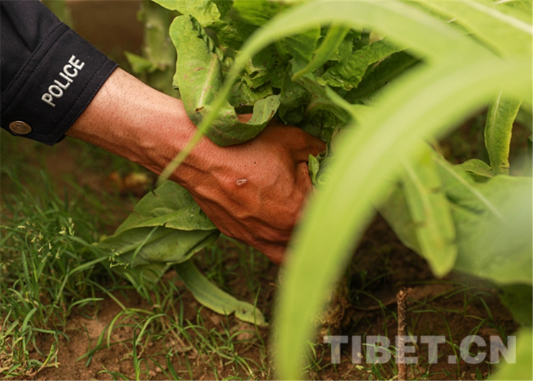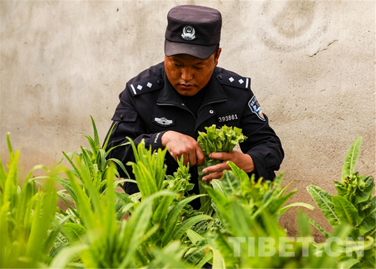 圖為珠峰邊境派出所民警正在采摘蔬菜 攝影:龍小鳳