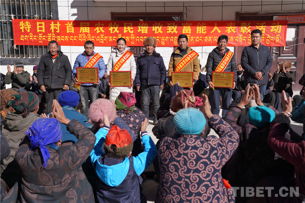 在表彰活動(dòng)現(xiàn)場(chǎng),高掛著特日村首屆農(nóng)牧民增收致富能人表彰活動(dòng)的大紅橫幅。洛桑白珍、尼瑪、格桑頓珠、桑杰巴珠四人身掛“2020年度農(nóng)牧民增收致富能人”綬帶接受表彰。在村“兩委”班子成員為這四人獻(xiàn)哈達(dá)、發(fā)獎(jiǎng)牌和每人500元的獎(jiǎng)金時(shí),現(xiàn)場(chǎng)的氣氛更是達(dá)到了高潮。