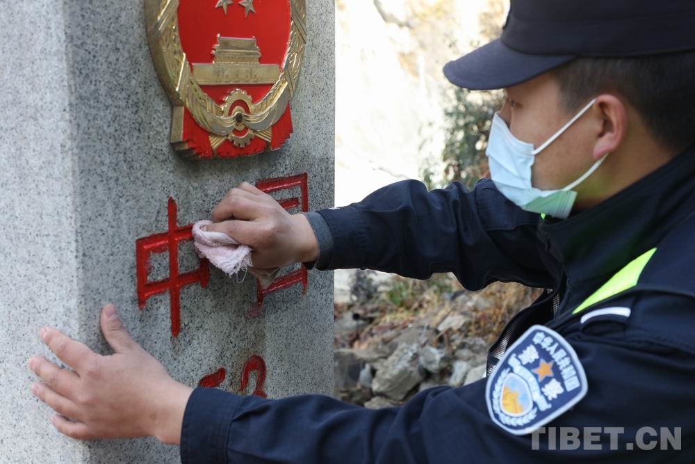 圖為執(zhí)勤點民警為神圣的界碑描紅 攝影:鄒興國