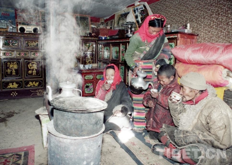 圖為藏北那曲鎮(zhèn)托美朗加一家人在喝酥油茶、吃油炸果,其樂融融 唐召明1989年攝