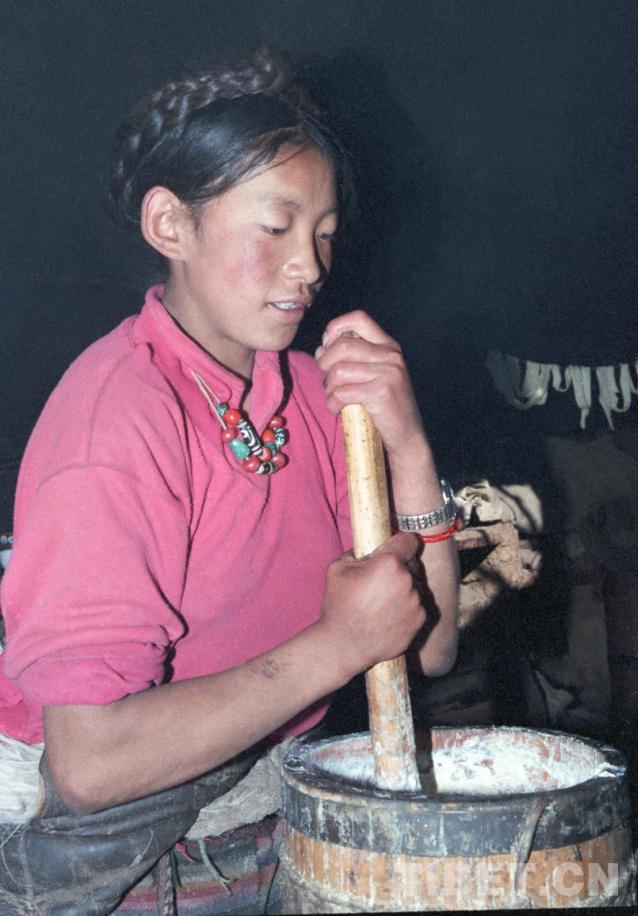 圖為藏北班戈縣牧女正在使用傳統(tǒng)的木桶打制酥油 唐召明1987年攝