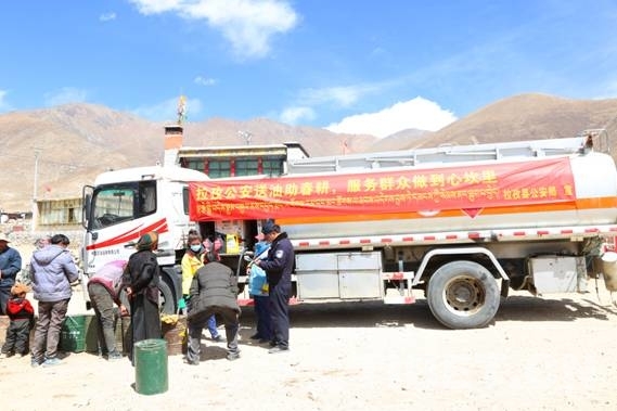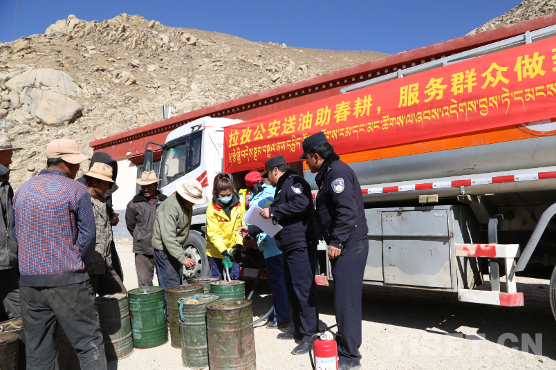因拉孜縣彭措林鄉(xiāng)、扎西崗鄉(xiāng)地處偏遠(yuǎn),村民購(gòu)買柴油困難,拉孜縣公安局及時(shí)與相關(guān)部門和中國(guó)石油拉孜分公司溝通協(xié)調(diào),適時(shí)掌握群眾用油需求,成立了拉孜公安送油小分隊(duì),指派專職民警跟著油車送油助春耕,將便民、惠農(nóng)服務(wù)延伸到田間地頭,讓群眾不出村就可以加到放心的柴油。
