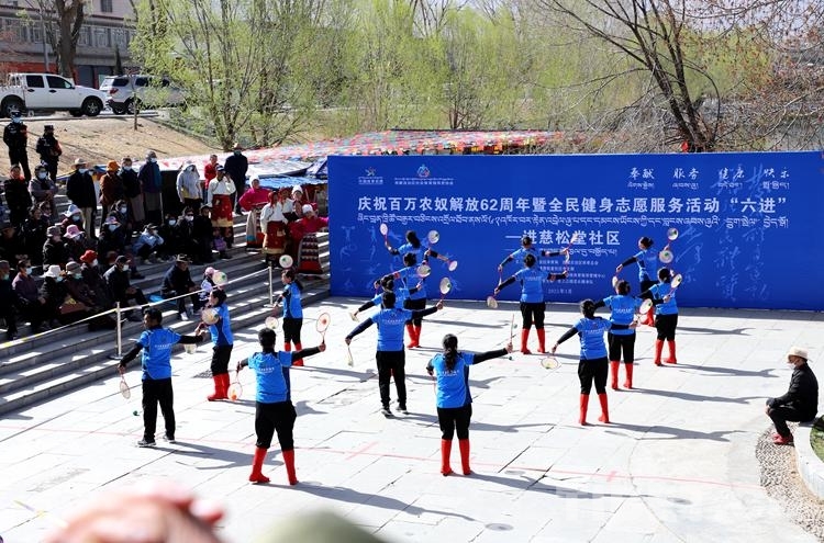 中國(guó)西藏網(wǎng)訊 3月27日,為慶祝西藏百萬(wàn)農(nóng)奴解放62周年,進(jìn)一步貫徹落實(shí)全民健身國(guó)家戰(zhàn)略,由西藏自治區(qū)體育局、西藏自治區(qū)體育總會(huì)、慈松塘社區(qū)黨支部主辦的慶祝百萬(wàn)農(nóng)奴解放62周年暨全民健身志愿服務(wù)“六進(jìn)”活動(dòng)走進(jìn)慈松塘社區(qū)。