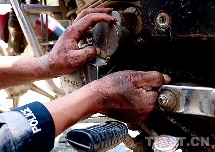 如果你經(jīng)過日喀則邊境管理支隊陳塘邊境派出所頓樟執(zhí)勤點,你有可能會在執(zhí)勤點旁邊的空地上看見一位不停揮舞著扳手,雙手沾滿機油的民警正圍著摩托車忙碌著。他叫王昱隆,是陳塘邊境派出所的一名民警,年初被分配到頓樟執(zhí)勤點,到現(xiàn)在他已經(jīng)義務幫助不少地過往行人維修摩托車了。