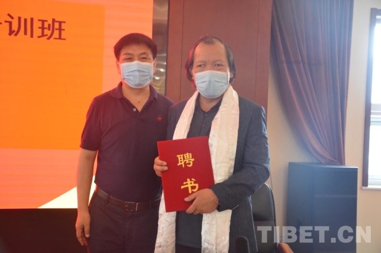 圖為仲格嘉向明珠同志頒發(fā)聘書(shū),聘請(qǐng)明珠為北京藏醫(yī)院藏藥浴專題培訓(xùn)班授課老師
