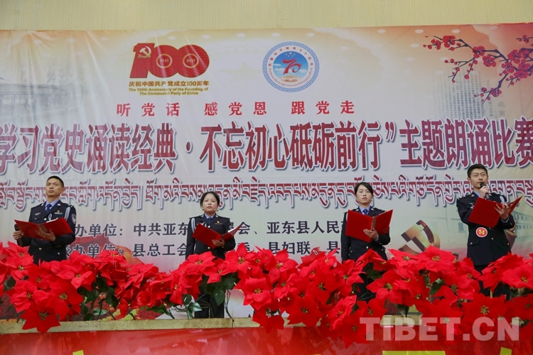 圖為西藏亞?wèn)|出入境邊防檢查站參加亞?wèn)|縣“學(xué)習(xí)黨史誦讀經(jīng)典、不忘初心砥礪前行”主題朗誦比賽