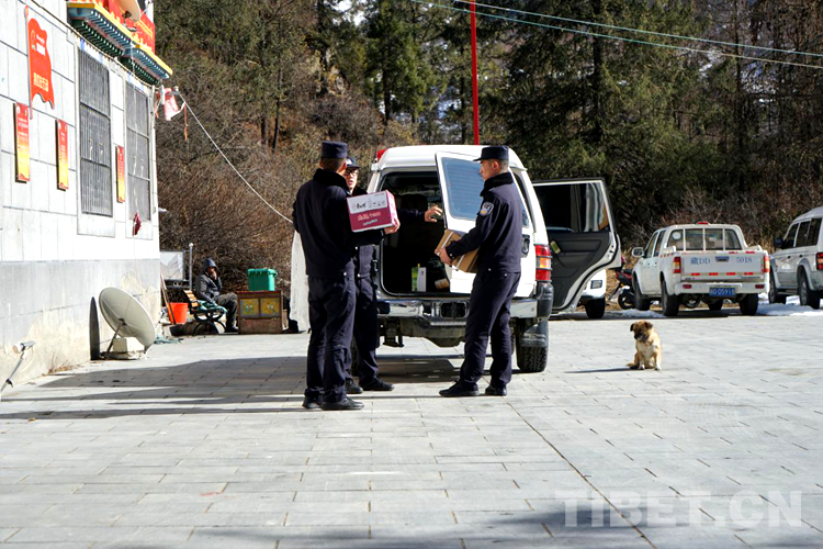 圖為洛桑旦增與民警們將宣傳冊(cè)裝上車(chē)