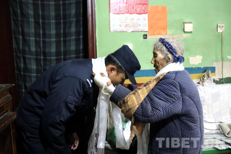 裝完宣傳冊(cè),洛桑旦增又匆忙跑回宿舍,取出早已準(zhǔn)備好的慰問(wèn)物品,驅(qū)車(chē)前往上亞?wèn)|鄉(xiāng)嘎林崗村。洛桑旦增是嘎林崗村的“民警村官”,格桑卓嘎成為他的定點(diǎn)幫扶對(duì)象。如今91歲的格桑卓嘠,曾在1965年與丈夫一起參與人民解放軍修筑乃堆拉山口路段的工程,幫助人民解放軍運(yùn)輸后勤物資和彈藥,丈夫去世后,老奶奶一直獨(dú)自生活。