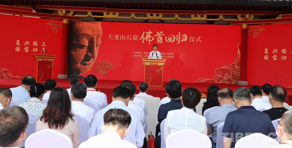 7月24日,天龍山石窟佛首回歸儀式在山西太原舉行。文化和旅游部副部長、國家文物局局長李群,山西省委書記、省人大常委會主任林武為“復興路上 國寶歸來”特展揭幕,山西省委副書記、山西省人民政府省長藍佛安,山西省委常委、太原市委書記羅清宇致辭,山西省委常委、宣傳部部長呂巖松,山西省委常委、秘書長李鳳岐,佛首捐贈人張榮出席儀式,山西省人民政府副省長張復明主持儀式。
