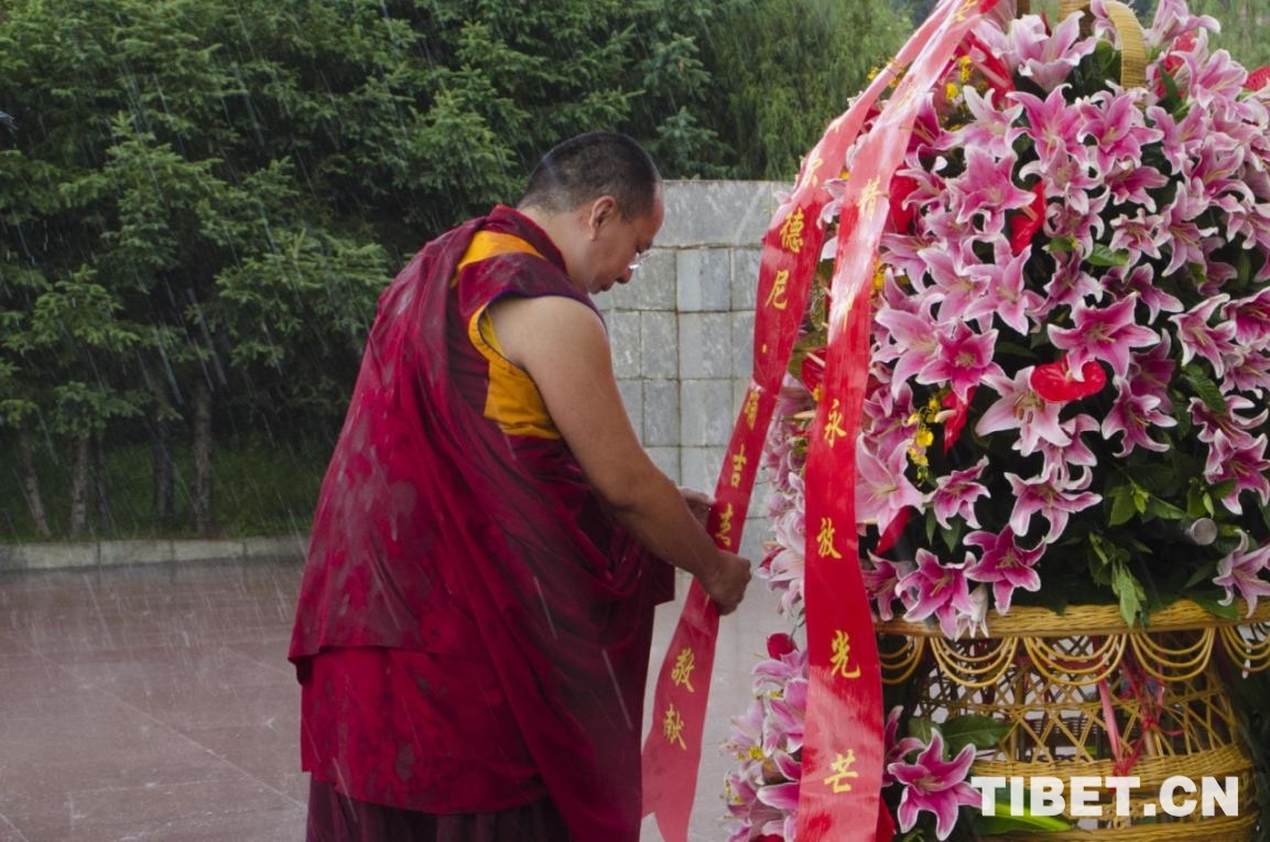 7月20日,班禪冒雨來到松潘縣紅軍長(zhǎng)征紀(jì)念碑碑園祭奠革命先烈。大雨更添哀思,全體默哀后,班禪緩緩走向紀(jì)念碑,在大雨中向革命烈士們敬獻(xiàn)花籃、哈達(dá),隨后走進(jìn)紀(jì)念館內(nèi),追憶長(zhǎng)征故事。