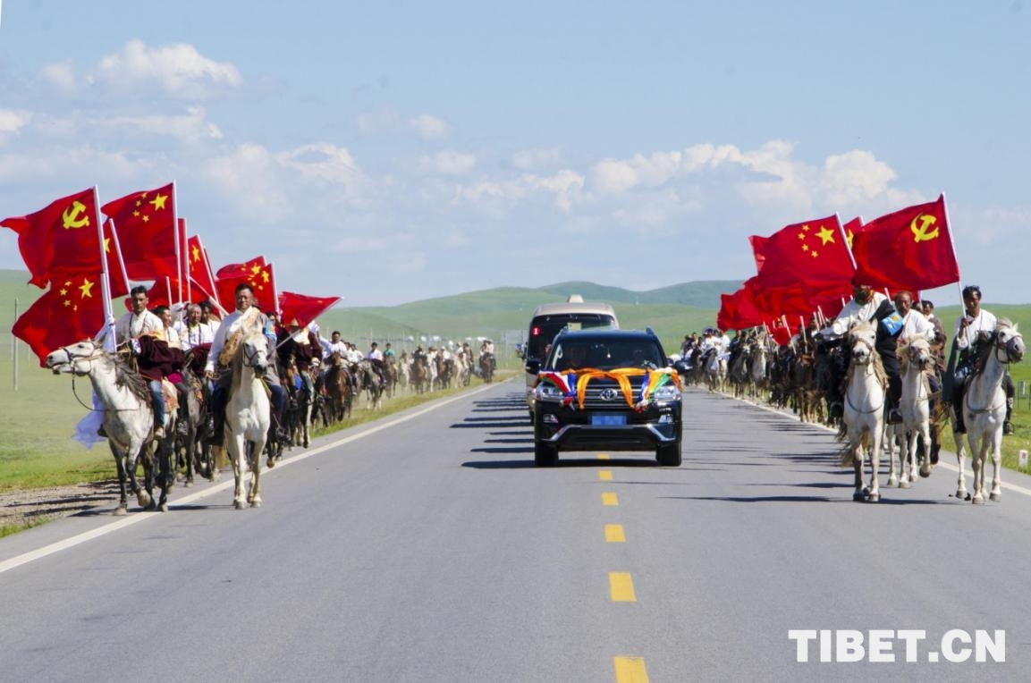 圖為調(diào)研結(jié)束時(shí),牧民騎馬為班禪送行 攝影:歐帆