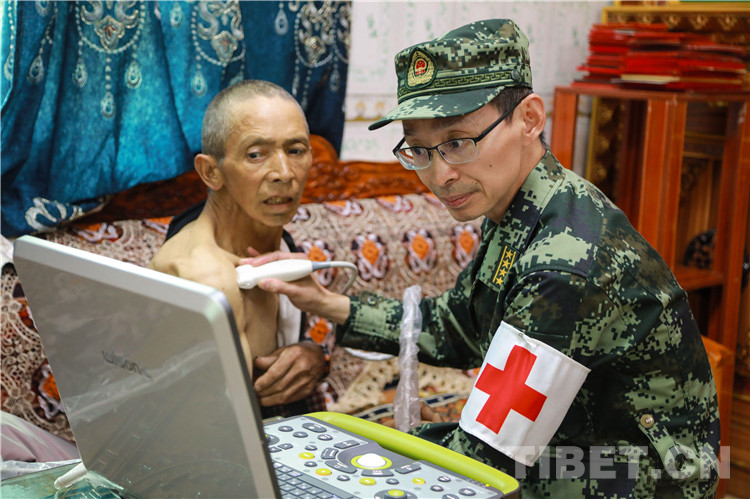 圖為軍醫(yī)吳赤球正在為村民詳細(xì)檢查身體