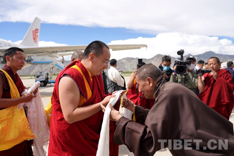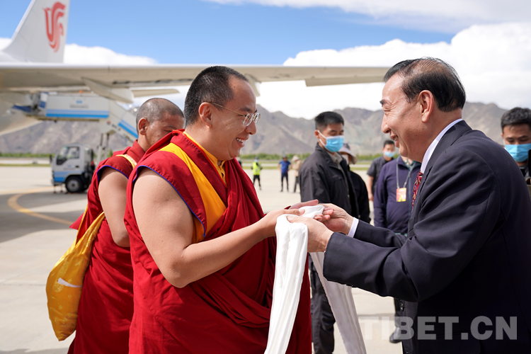 西藏自治區(qū)黨委常委、統(tǒng)戰(zhàn)部部長,區(qū)政協(xié)黨組副書記、副主席旦科等西藏自治區(qū)相關領導在貢嘎機場迎接,互敬哈達。