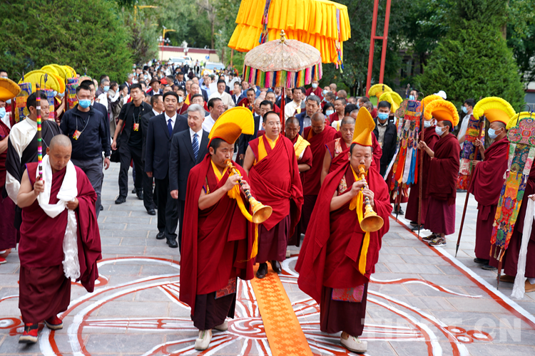 在雪林多吉頗章主殿門前,僧眾提前繪制了金剛結等吉祥圖案,尺許寬的地毯從歡迎隊伍處一直延伸到主殿門前。法號響起,高僧們手持香爐,打著幡幛、華蓋,吹奏佛樂,以藏傳佛教隆重的禮儀迎接班禪的到來。在眾高僧的簇擁下,班禪向夾道歡迎的僧俗信教群眾頷首微笑、揮手致意。在僧俗信教群眾目光的緊緊追隨中,班禪緩步進入雪林多吉頗章主殿。(中國西藏網(wǎng) 記者/王淑 旦增拉姆 歐帆)