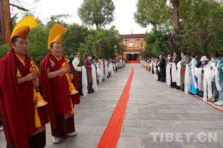 隨后,班禪乘車抵達位于拉薩的班禪行宮雪林多吉頗章。細雨綿綿的拉薩城,清風習習涼爽宜人。西藏自治區(qū)黨委常務副書記、自治區(qū)政協(xié)黨組書記莊嚴與十九屆中央候補委員,西藏自治區(qū)黨委副書記、拉薩市委書記嚴金海等西藏自治區(qū)相關領導在此迎候。拉薩各大寺廟的僧眾代表和信教群眾代表手捧潔白的哈達在微微細雨中翹首以盼班禪的到來。
